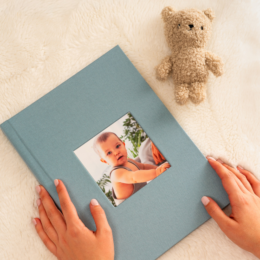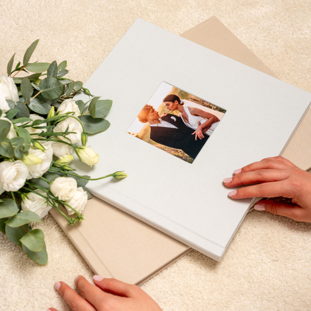 No modelo Cameo, a capa abre uma janela para a emoção. A tua fotografia favorita é integrada de forma permanente na capa em tecido, criando um leve relevo que a transforma no coração do álbum e num convite imediato para descobrir as memórias que guarda no interior.