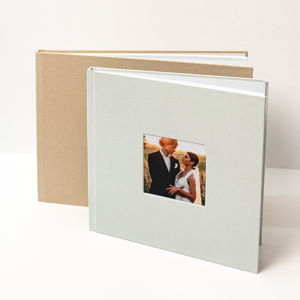 A janela do modelo Cameo é mais do que um detalhe, é uma declaração. A fotografia de 11 x 11 cm é impressa e cuidadosamente embutida na capa, fazendo parte da sua estrutura. Não é um encaixe para troca, mas sim a peça central e permanente do design do álbum. O tamanho da janela é o mesmo em todos os formatos, garantindo sempre o protagonismo da imagem.